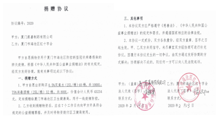 廈門市蔚嘉化學科技有限公司向海滄醫(yī)院、長庚醫(yī)院、新陽醫(yī)院、海滄街道、嵩嶼街道、新陽街道共捐贈75%酒精800升,0.5%雙氧水1000升。