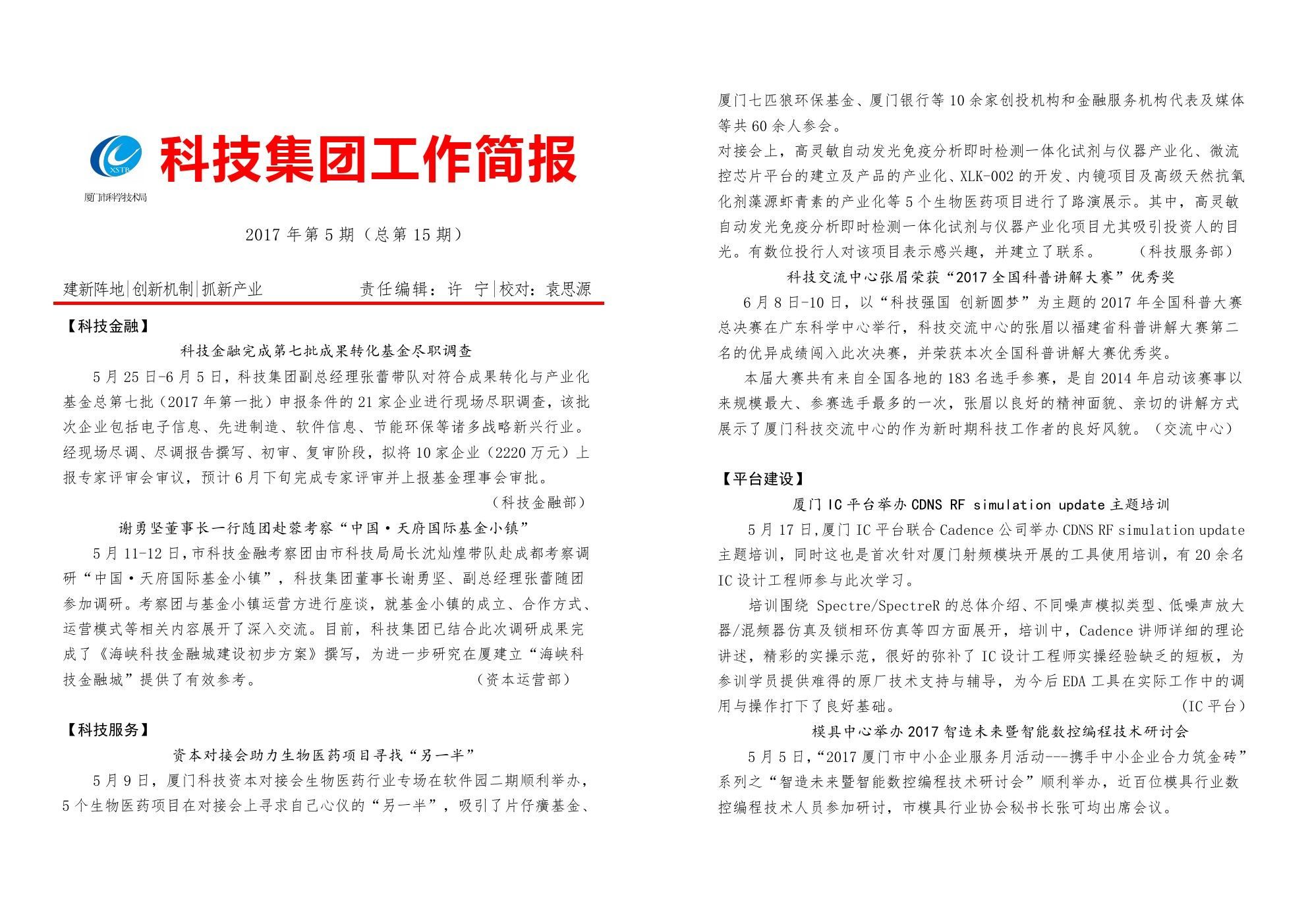 產(chǎn)業(yè)化公司工作簡(jiǎn)報(bào)第5期(總第15期) 欄目:集團(tuán)資訊 來(lái)源:廈門(mén)科技產(chǎn)業(yè)化集團(tuán) 時(shí)間:2017-09-28 熱度:167