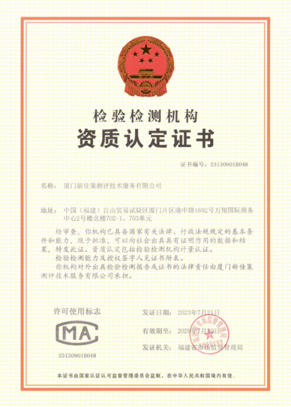 喜報!廈門科技產(chǎn)業(yè)化集團(tuán)參股企業(yè)--廈門新佳策測評技術(shù)服務(wù)有限公司獲得CMA資質(zhì)認(rèn)定