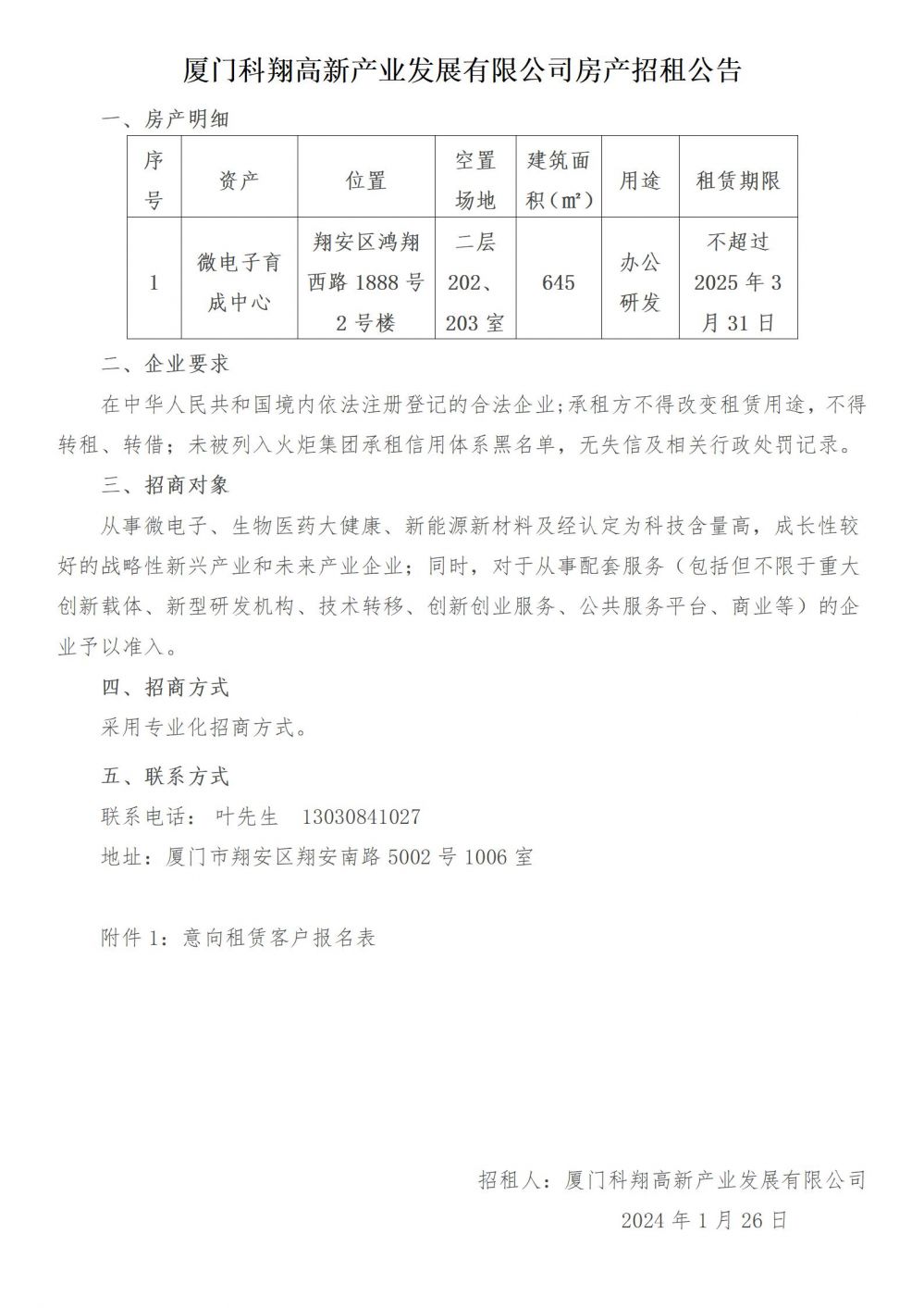 廈門科翔高新產(chǎn)業(yè)發(fā)展有限公司房產(chǎn)招租公告 欄目:通知公告 來(lái)源:廈門科技產(chǎn)業(yè)化集團(tuán) 時(shí)間:2024-02-01 熱度:210