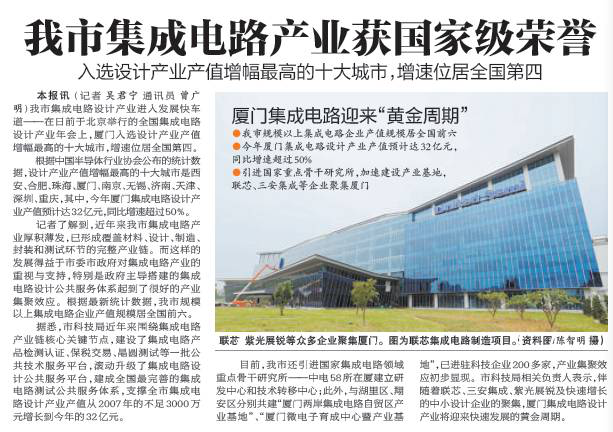 在全國(guó)集成電路設(shè)計(jì)產(chǎn)業(yè)年會(huì)上,廈門(mén)入選設(shè)計(jì)產(chǎn)業(yè)增幅最高的十大城市,增速位居全國(guó)第四。
