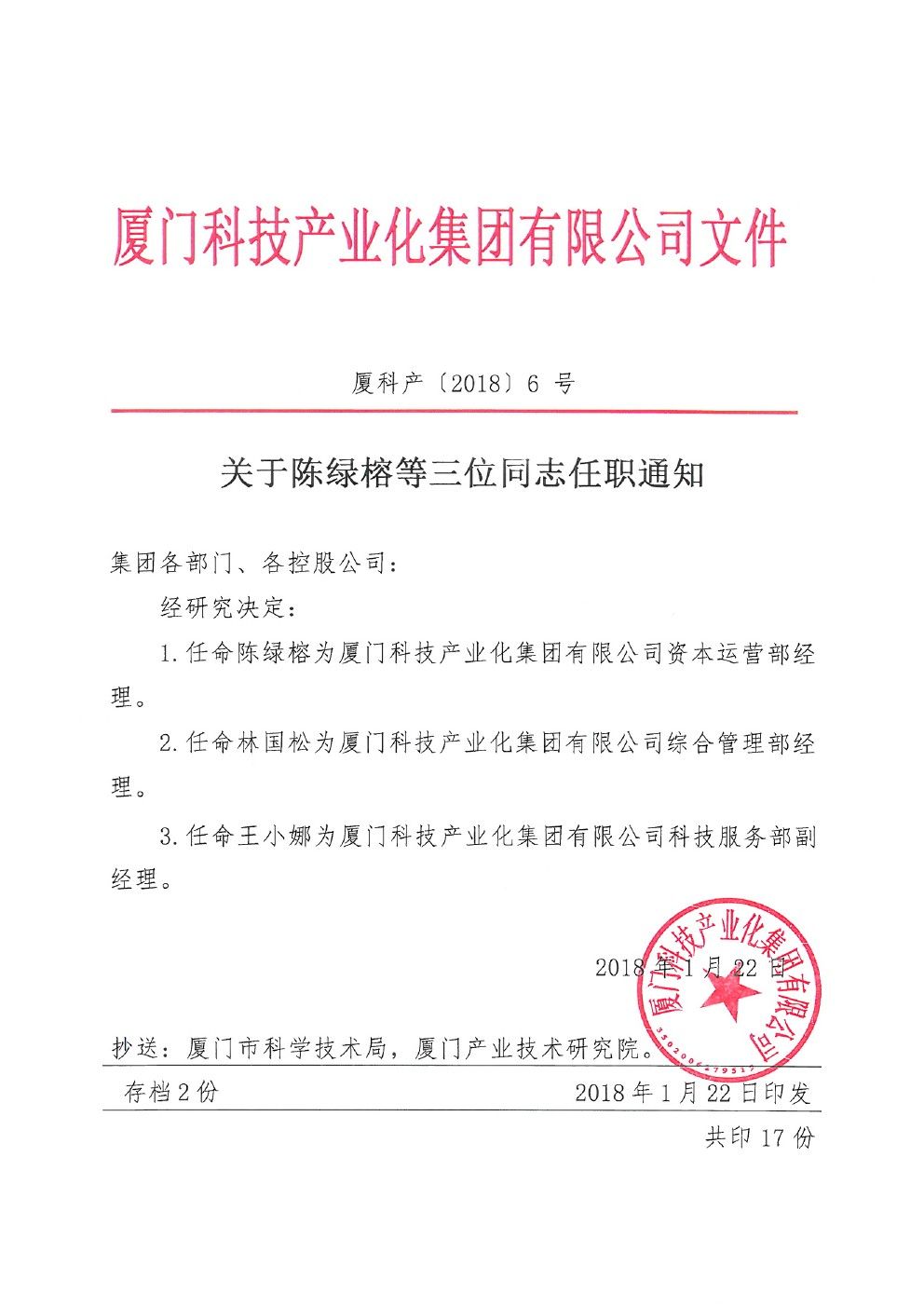 關(guān)于陳綠榕等三位同志任職通知 欄目:通知公告 來源:廈門科技產(chǎn)業(yè)化集團(tuán) 時間:2018-01-25 熱度:456 關(guān)于陳綠榕等三位同志任職通知.pdf