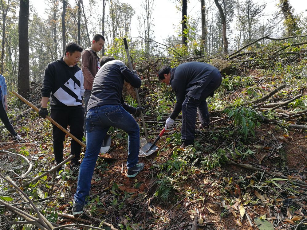 由于近日來的綿綿陰雨,使坂頭林場原本坑洼不平的山地更加泥濘,但這絲毫沒有阻擋干部職工的植綠添綠熱情,幾人一組,分工協(xié)作,掄鋤挖坑、扶直樹苗、揮鍬培土、踩實壓緊,配合默契而有序。大家栽得認真,干得賣力,顧不上汗水打濕衣裳,也顧不上泥濘裹滿了鞋履。經(jīng)過近兩個小時的辛勤勞動,75株木荷樹苗迎風而立。